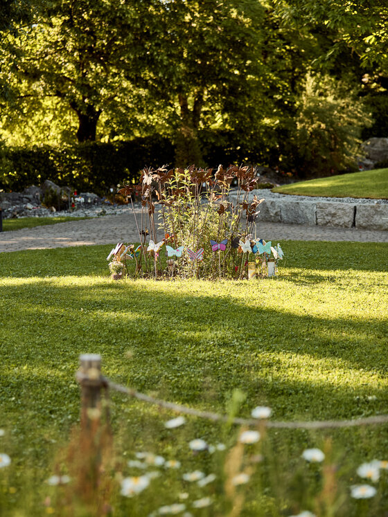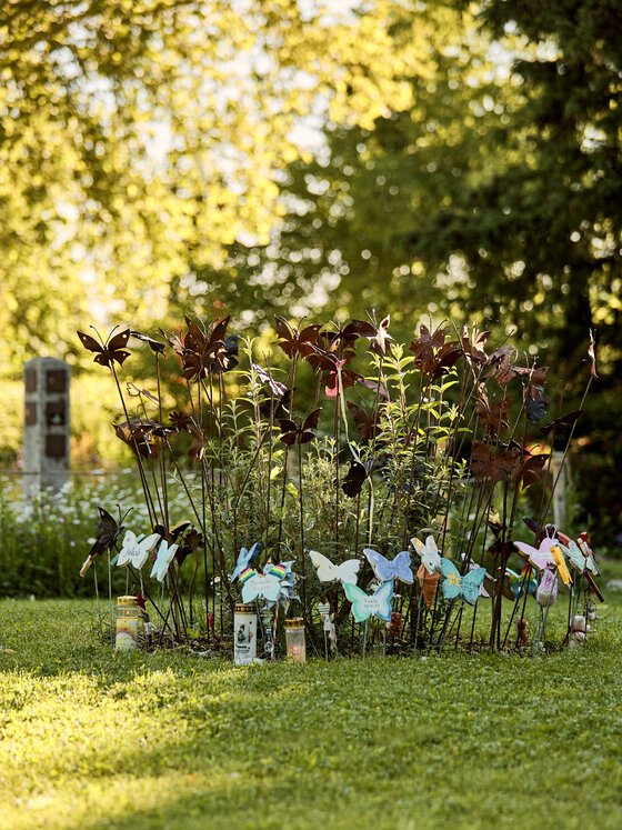 Die Symbolik des Schmetterlings findet sich auch im Gedenkwald wieder, wo das Kindergrabfeld durch das sogenannte Schmetterlingsrondell gekennzeichnet ist. Hier werden die Namen der Kinder auf Namenstafeln in Form von Schmetterlingen verewigt. Eltern haben die Möglichkeit, die Namenstafel von ihrem Kind selbst zu gestalten.