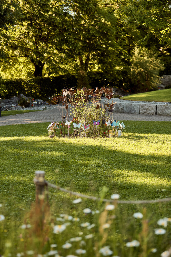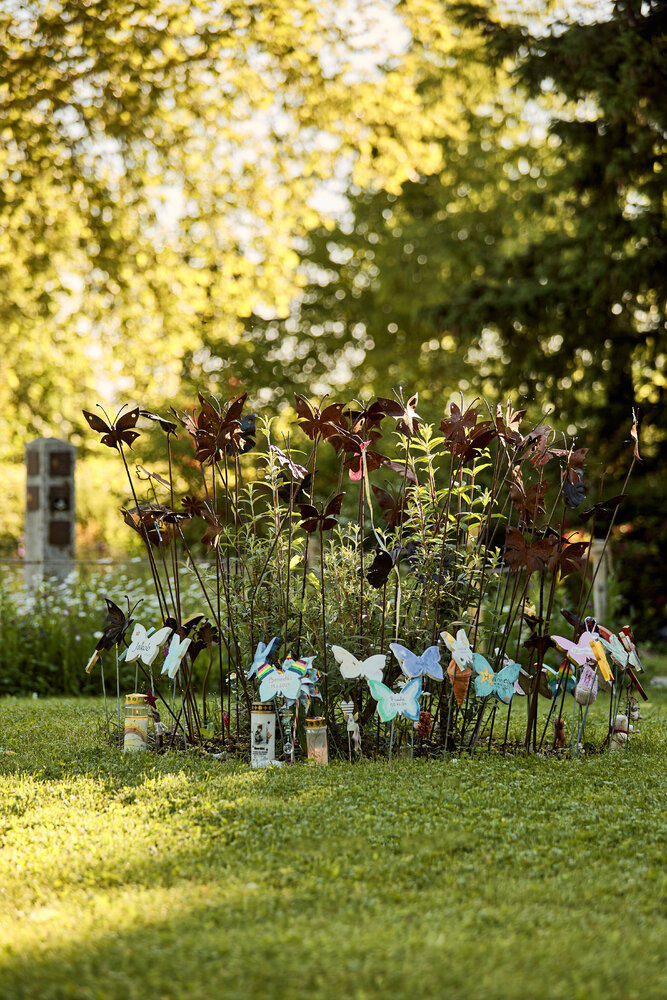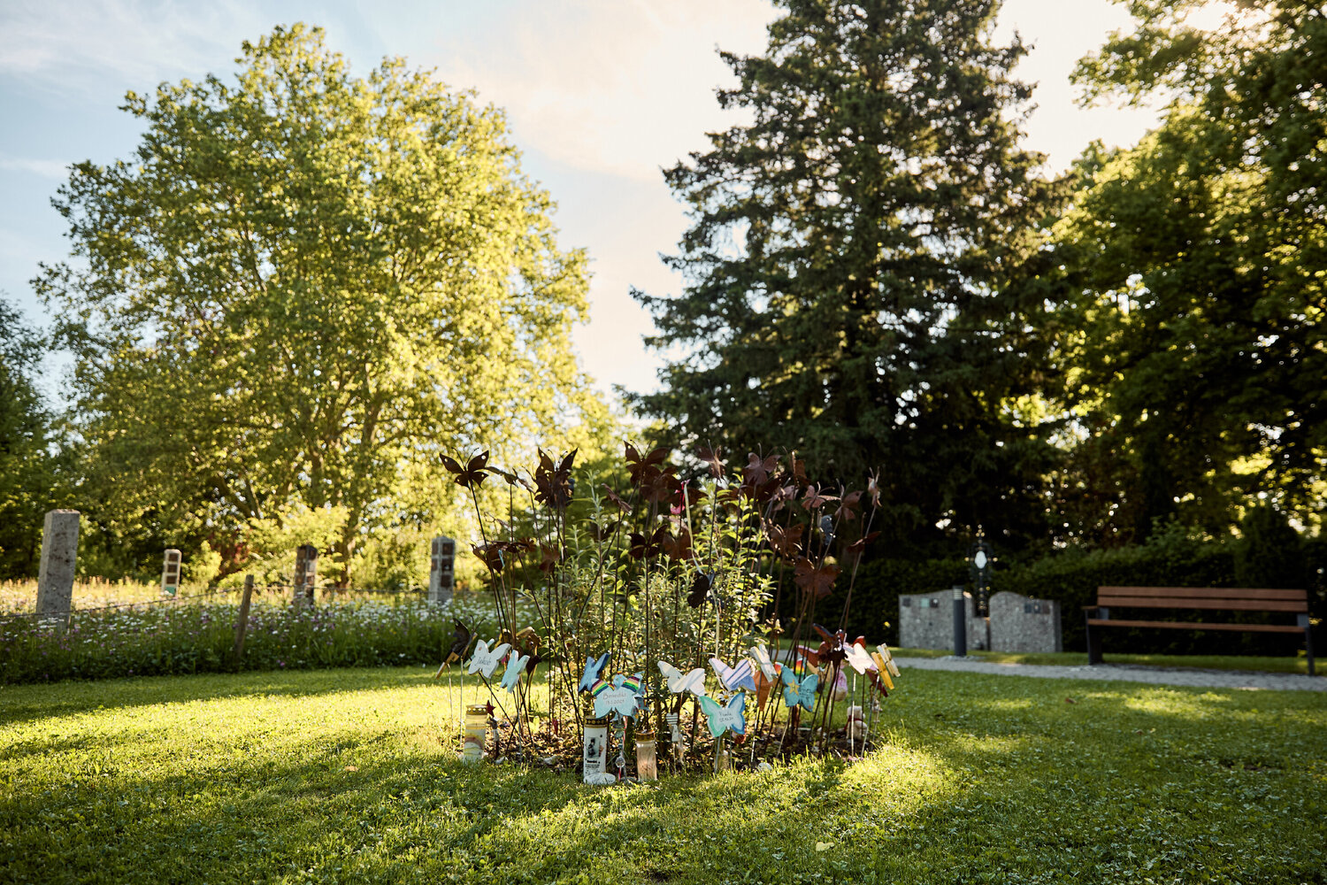 Das Schmetterlingsrondell im Gedenkwald ist ein besonders behutsamer Ort des Erinnerns. Hier finden verstorbene Kinder und Sternenkinder einen geschützten Platz der liebevollen Verbundenheit. Individuell gestaltete Schmetterlings-Namenstafeln bewahren die Erinnerung und setzen ein stilles Zeichen der Hoffnung.