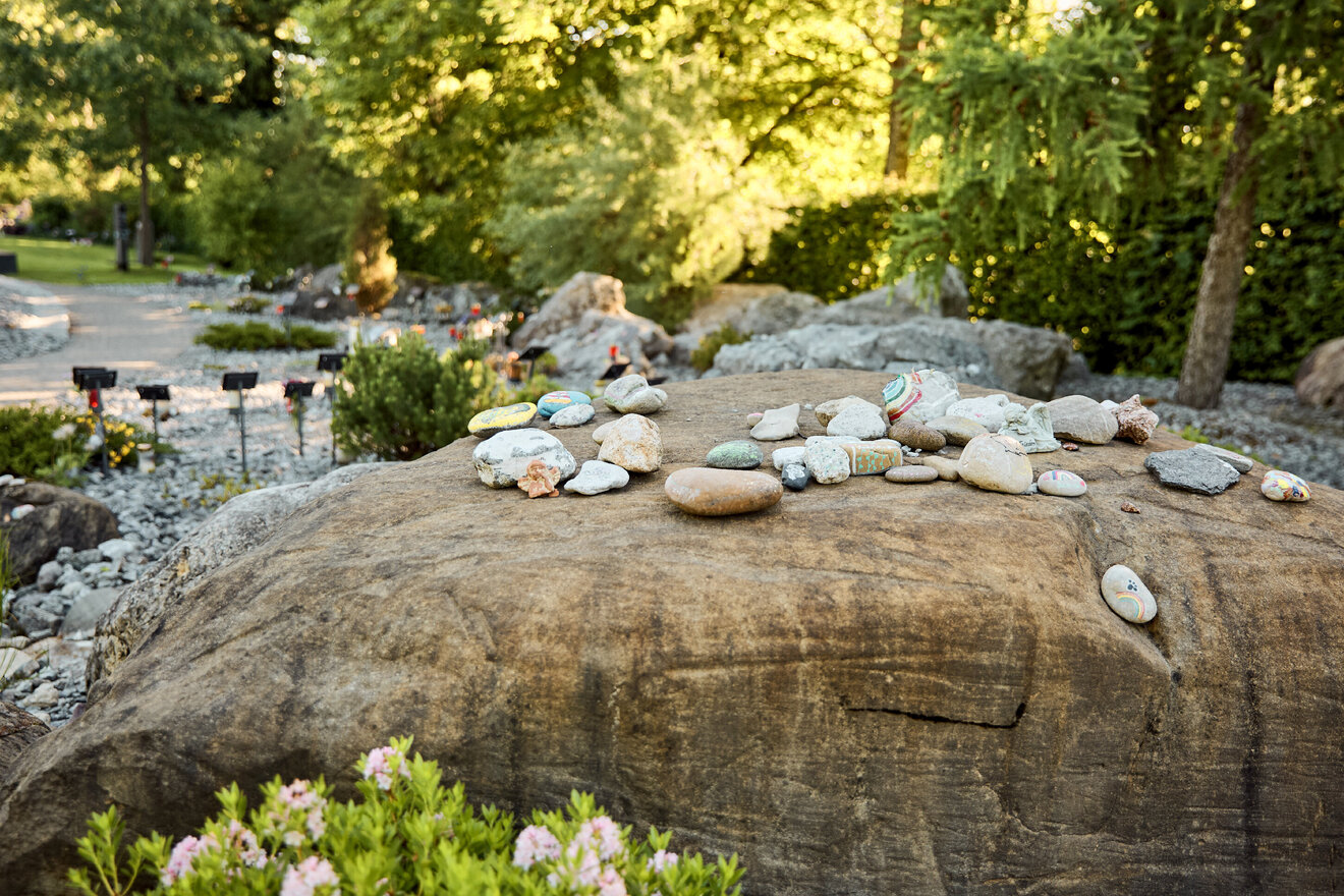 Beisetzungsareale, die speziell für Naturbestattungen vorgesehen sind, sollen naturbelassen bleiben. Das ist der Grund dafür, dass im Rahmen von Naturbestattungen kein Grabschmuck gestattet ist. So dürfen beispielsweise keine Erinnerungsgegenstände auf der Grabstätte niedergelegt werden. Auch die individuelle Bepflanzung des Grabes und das Aufstellen von Grabsteinen sind nicht erlaubt. All das gilt auch für Naturbestattungen im Gedenkwald Au, denn die parkähnliche und naturnahe Gestaltung des Gedenkwaldgartens soll aufrechterhalten bleiben. Mit unseren Angeboten zur Trauerarbeit bieten wir Ihnen gute Alternativen und Möglichkeiten an. Sie können Ihre Gedanken auf Schiefertafeln ausdrücken oder eine Postkarte in unseren Trauerbriefkasten einwerfen. Kerzen können an den dafür vorgesehenen Stellen entzündet werden und bemalte Steine an den Ablagestellen niedergelegt werden. Ebenso können Sie die Namenstafel für Ihren Verstorbenen individuell gestalten und damit eine schöne Erinnerung schaffen.